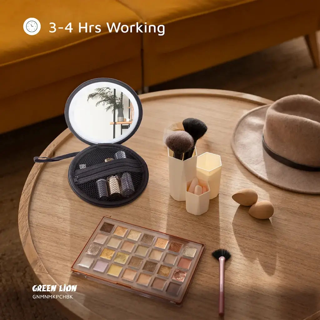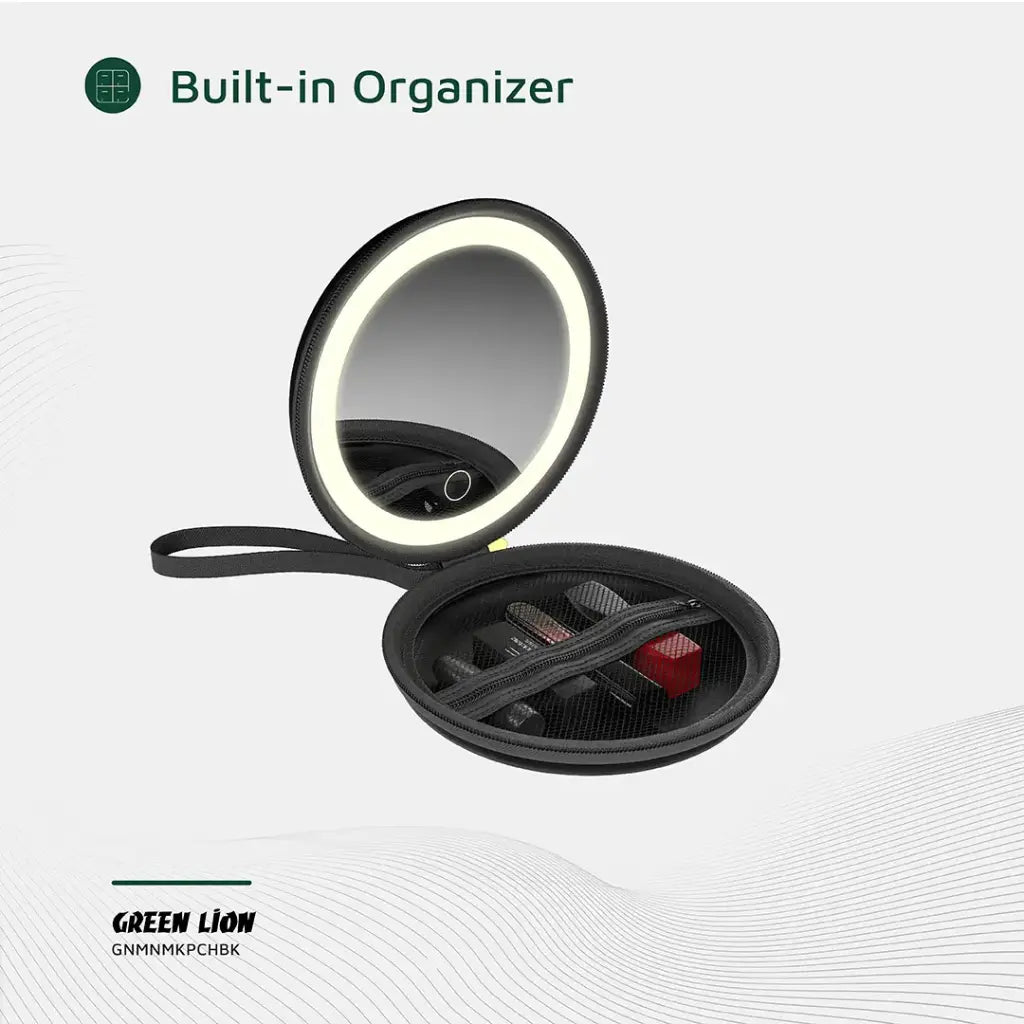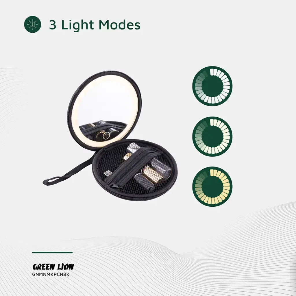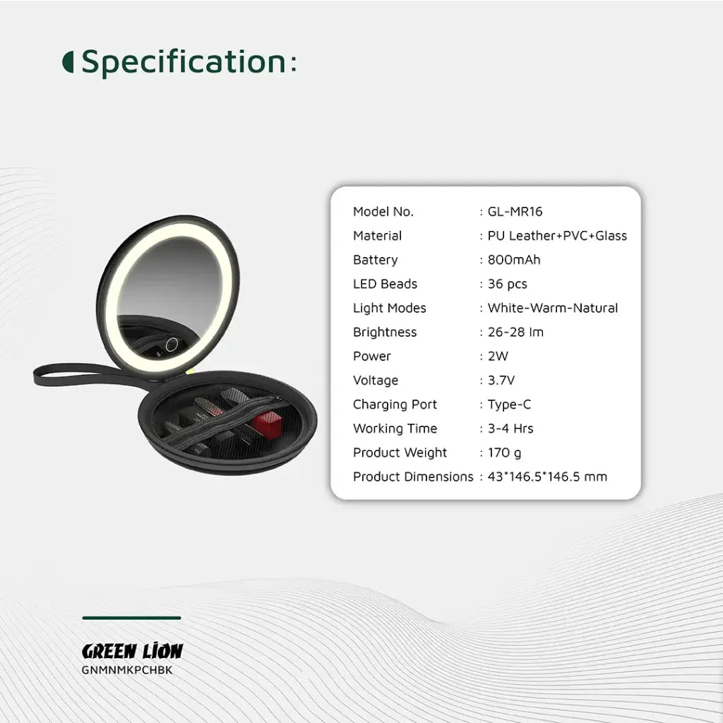 Look stunning wherever you go with the Green Lion Mini Makeup Pouch, your ideal travel companion. This stylish pouch, crafted from premium PU Leather, rugged PVC, and high-grade Glass, is all about style and practicality. Fitted with a built-in high-definition mirror, ensuring clarity for precise makeup application. 1 Illuminate your reflection to perfection with the in-built lighting system powered by 36 efficient LED beads. Choose from three varying light modes – White, Warm, and Natural – and change the brightness (26-28 lm) at ease using the handy touch control switch. Enjoy 3-4 hours of continuous usage on a large 800mAh battery and charge easily via a universal Type-C port (3.7V, 2W). An in-built organizer is kept within to keep your makeup tidy and in hand. Its compact, travel-sized format makes it ideal for fast touch-ups on the go, so you can always be your best.